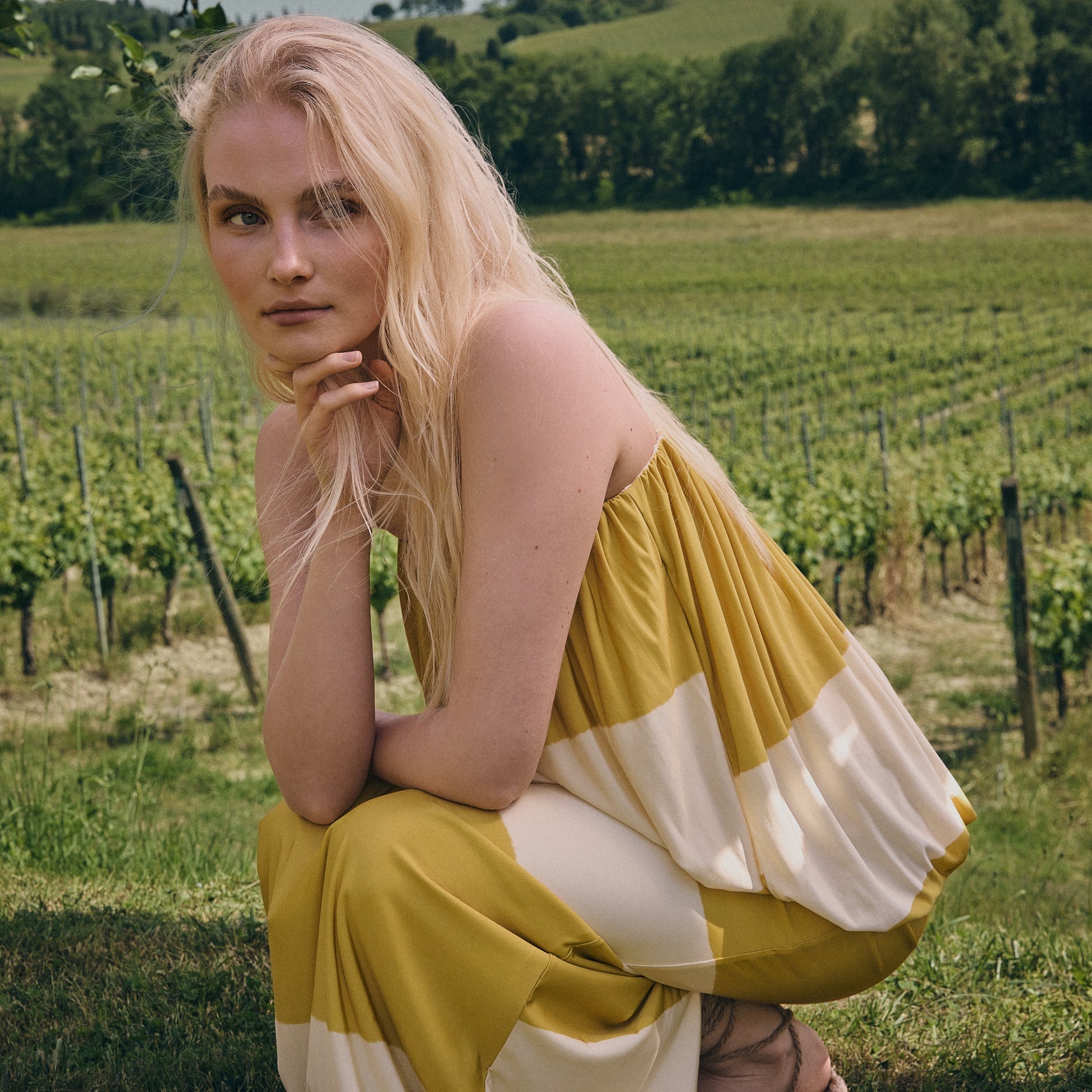 Vestido largo que presenta un juego de rayas horizontales en tonos pistacho y natural, con escote recto y delicados cargaderos. El detalle de blusón superior aporta movimiento y un aire relajado y femenino.