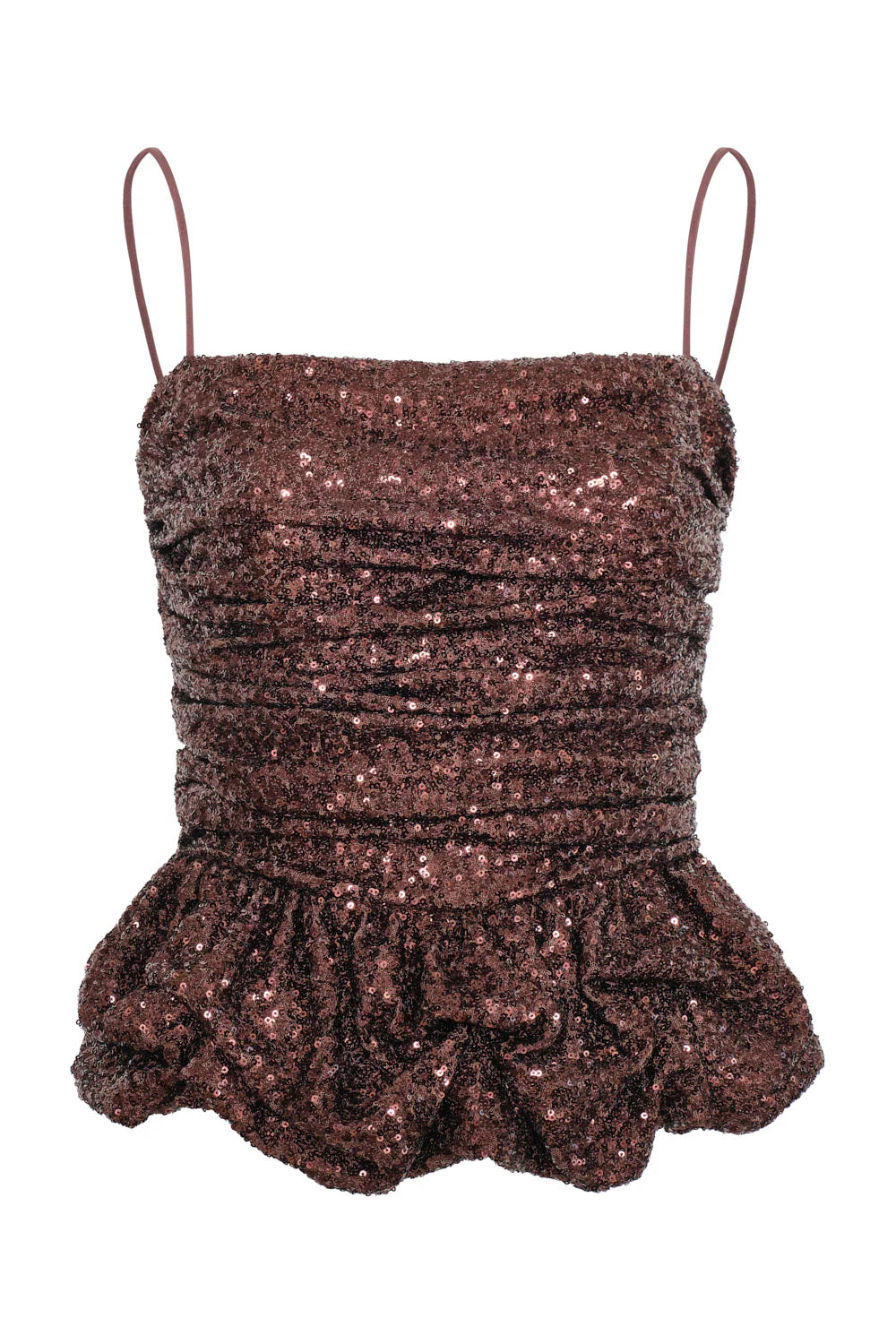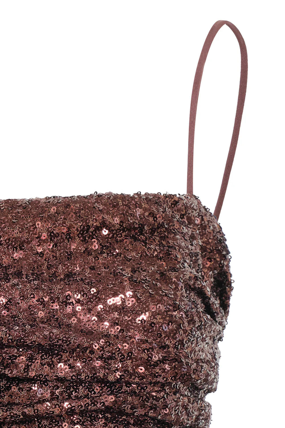 Crop top maia brown lentejuelas. Crop top femenino y cautivador se destaca por su silueta tipo dona, realzada con un delicado drapeado frontal que enmarca el busto y aporta textura. Sus tiras tipo spaghetti añaden un sutil toque de sensualidad y frescura.