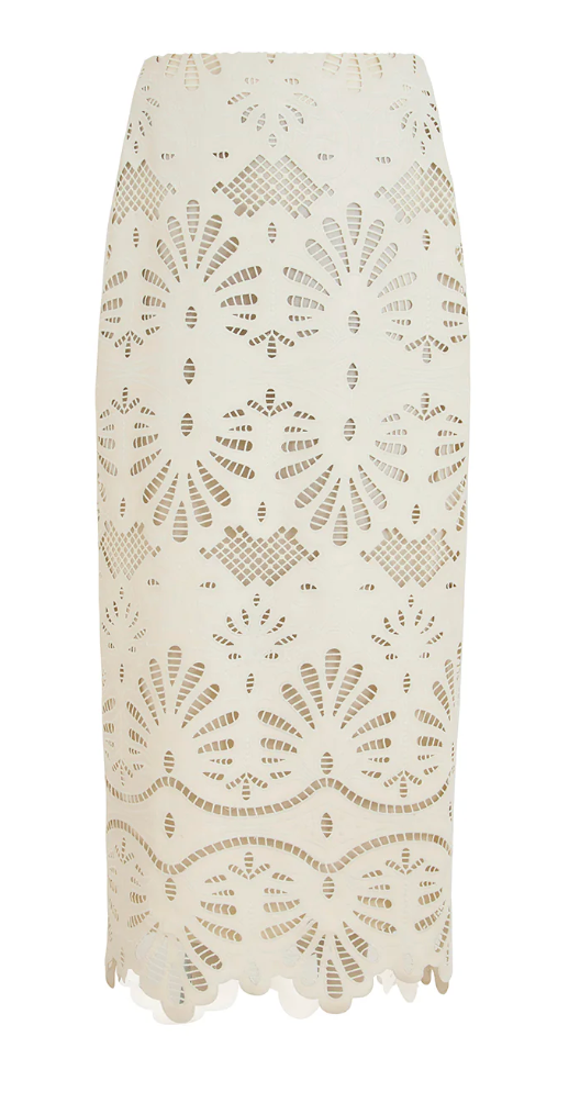 Falda Aura crema. Confeccionada en un tejido calado con patrón floral y geométrico que combina formas de abanico y rombos. Está elaborada en un tono marfil o blanco hueso, lo que le da un aire elegante y delicado, aportando un efecto ligero y sofisticado. La confección es precisa y los bordes de los calados tienen un acabado limpio que resalta la calidad artesanal de la pieza.