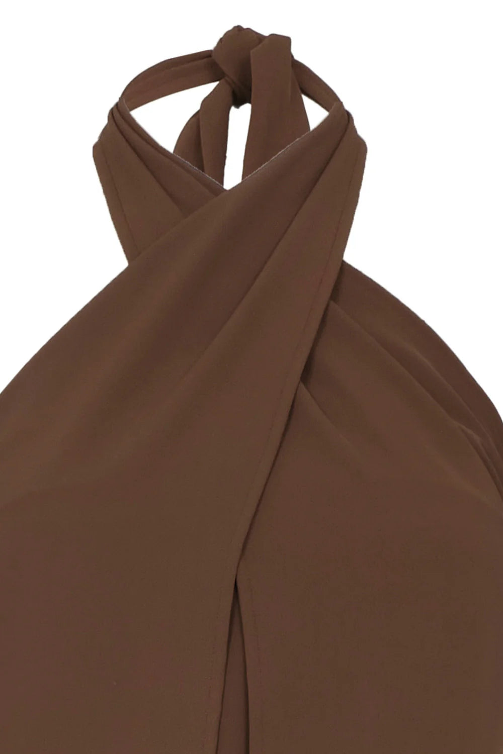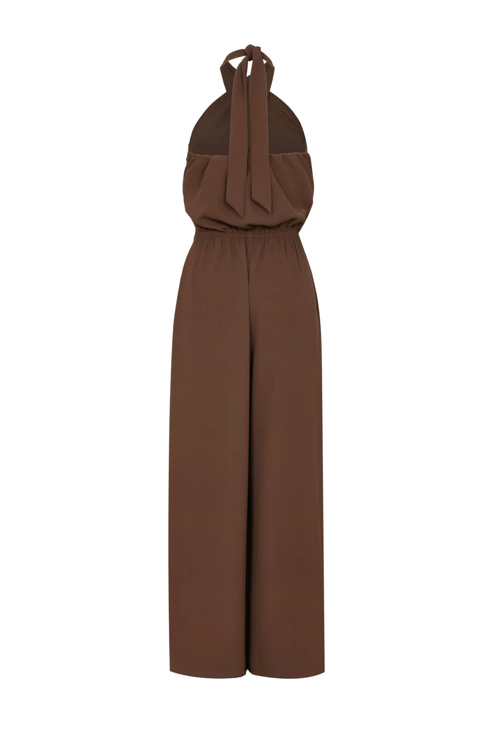 Enterizo celeste coffee. Su escote halter cruzado aporta un aire elegante y femenino, mientras que la espalda descubierta con amarre ancho le da un toque moderno.