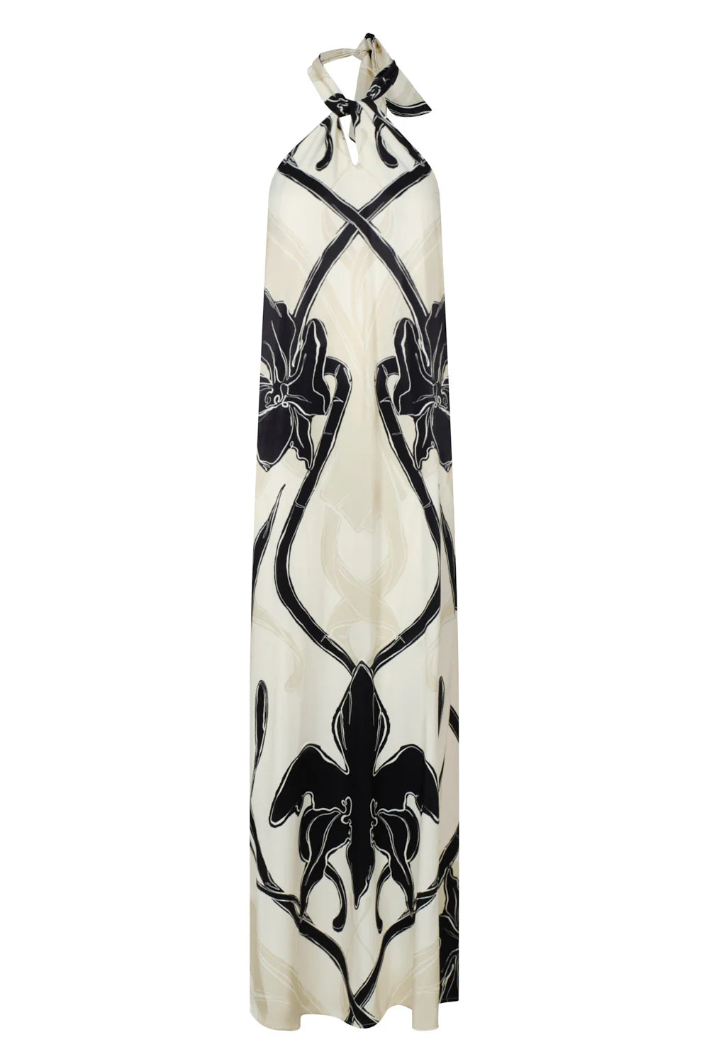 Vestido filosofia ivory negro. Vestido largo con silueta fluida y estampado botánico en contraste, ideal para looks frescos y sofisticados. Su diseño presenta un escote halter cruzado que se anuda delicadamente en la parte posterior, aportando un toque femenino y elegante. La espalda descubierta realza la figura y añade un aire sensual sin perder delicadeza.