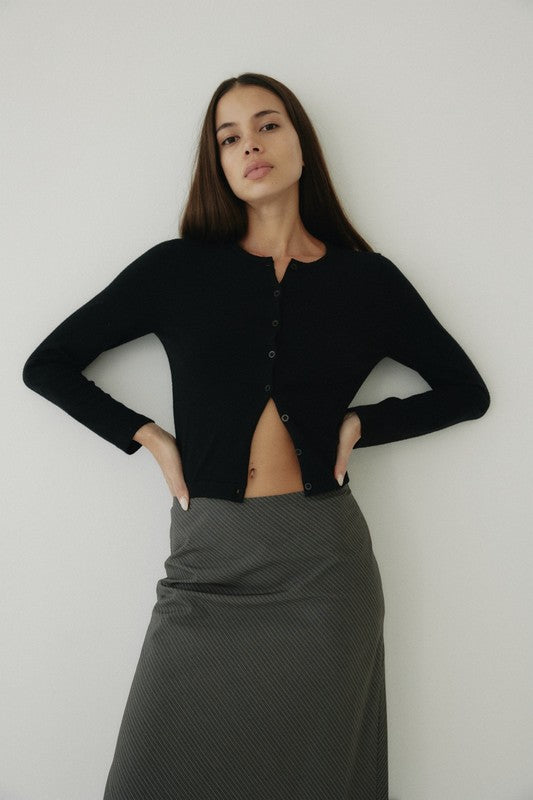 The Ginny Skirt is a sophisticated pinstripe A-line bias skirt with a raw edge waist and an invisible side zipper. Style it with a fitted top or blouse and ballet flats for a chic, contemporary ensemble.