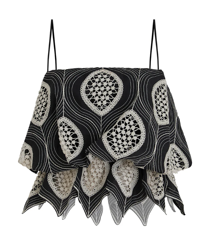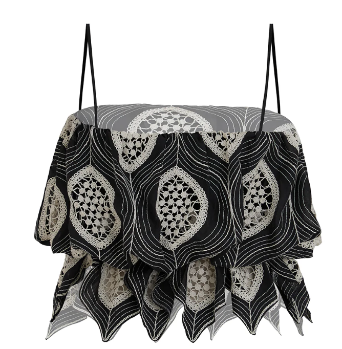 Una pieza estructurada y femenina con diseño de capas en forma de pétalos que aportan volumen y movimiento. Su textura fresca y natural lo convierte en el aliado ideal para días soleados. Sus delicados tirantes regulables y su silueta corta enmarcan la cintura con sofisticación.