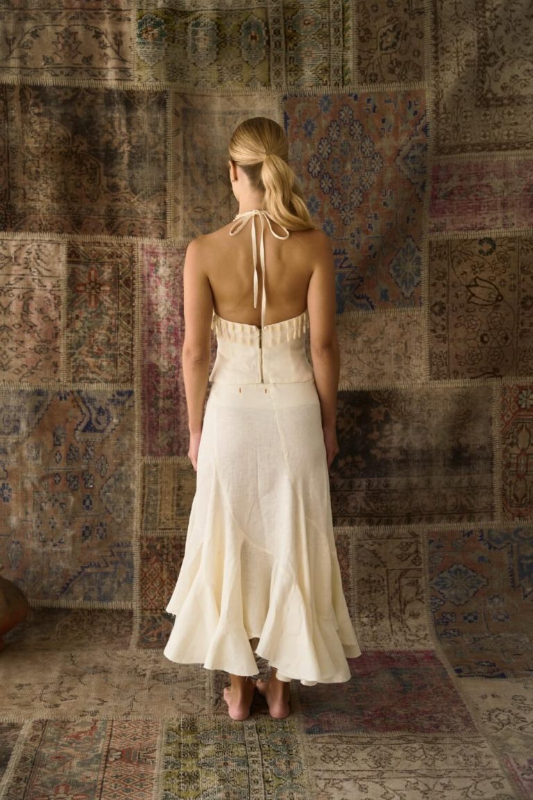 Mid rise skirt with a side invisible zipper and playful ruffle accents, falls to mid calf length for an elegant, flowing silhouette.