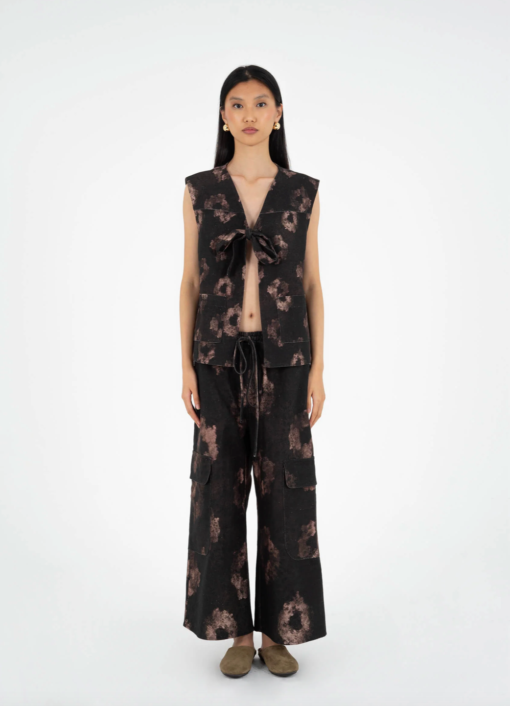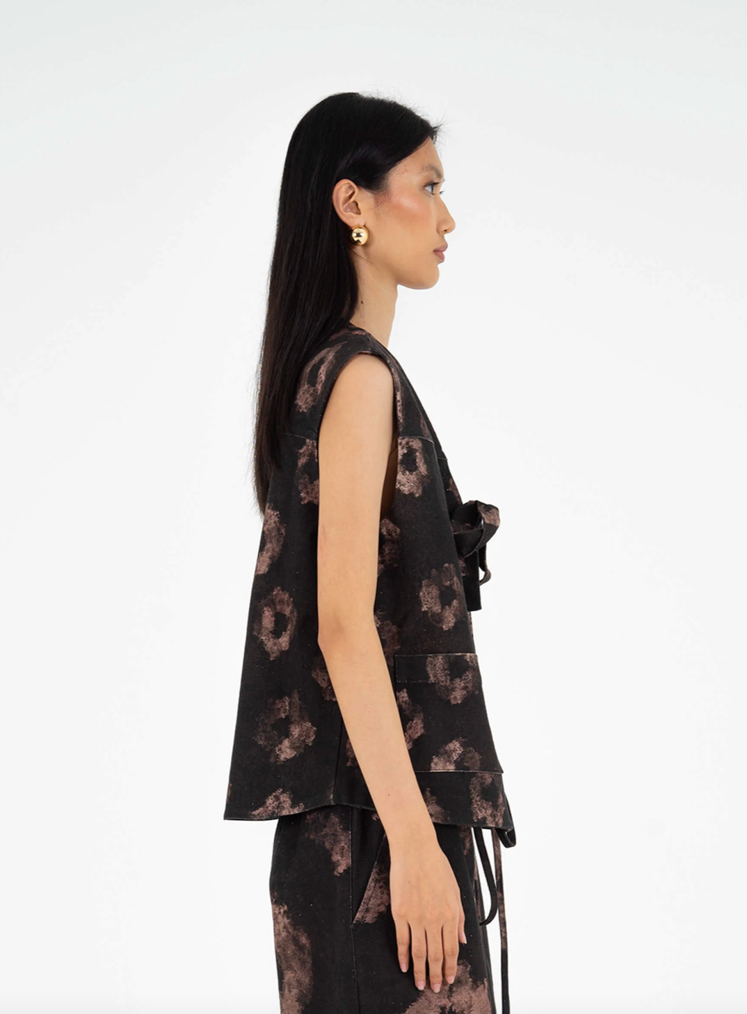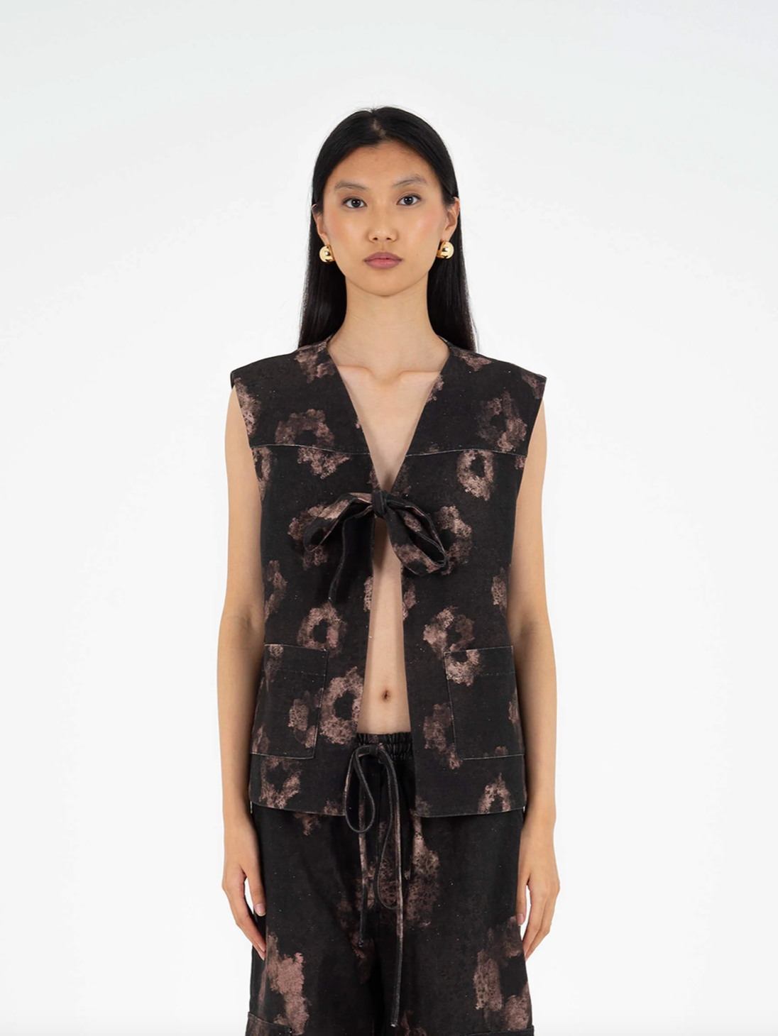 Chaleco denim estampado. Detalle de bolsillos y cierre con lazada en el delantero.